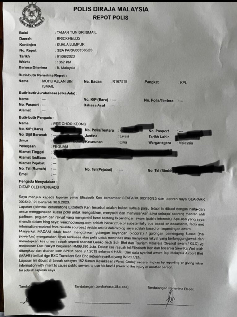 On 31-5-2023 at about 8 pm, soon after the police had recorded yours truly’s statement with regards to the alleged criminal defamation based on two articles written by yours truly in HERE and HERE, yours truly had lodged a report against Elizabeth Ken Tzu Ying for lodging a false report, HERE.