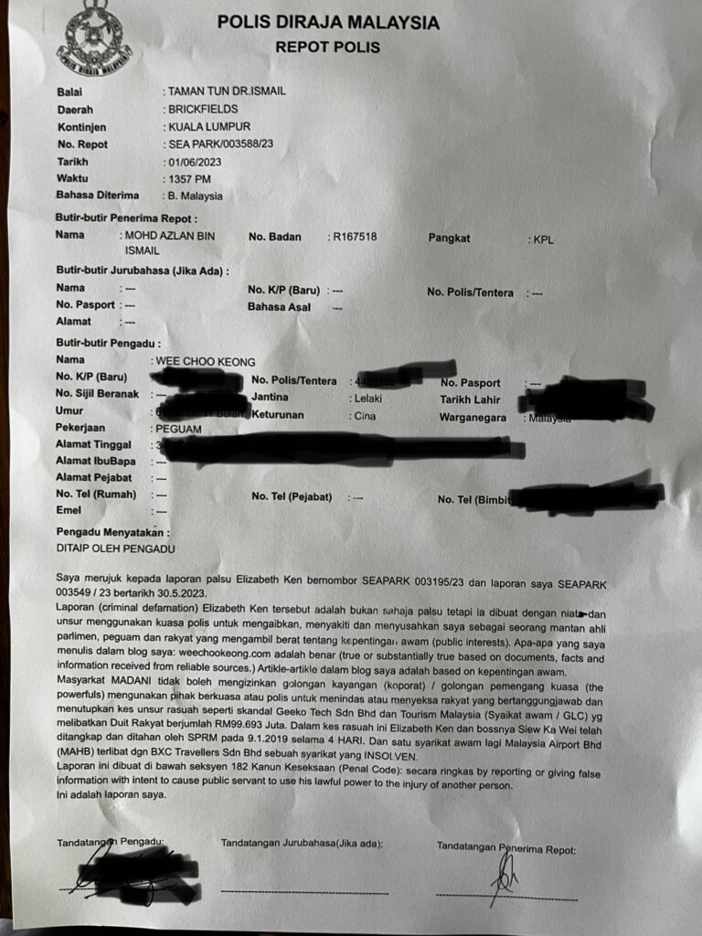 Siew Ka Wei’s staff, Elizabeth Ken Tzu Ying aka Elly Ken lodged a report alleging criminal defamation based on two articles posted on my blog, which you can find in HERE and HERE.